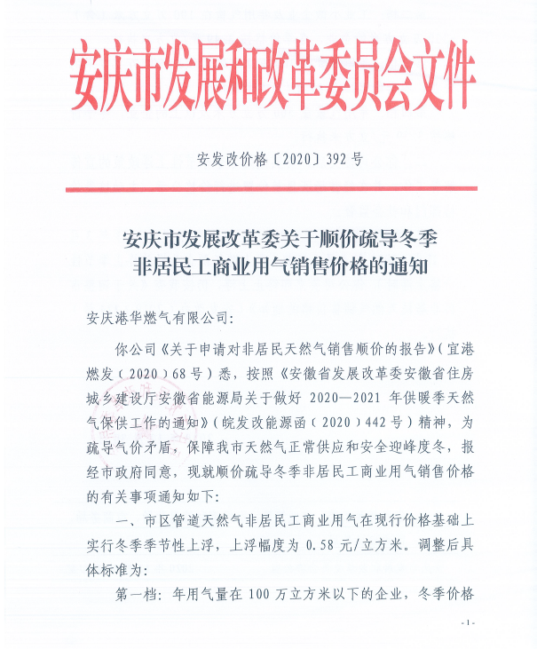 安慶市發(fā)展改革委關(guān)于順價(jià)疏導(dǎo)冬季非居民工商業(yè)用氣價(jià)格的通知(2020)