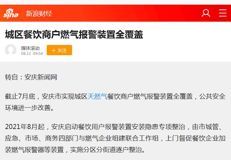 城區(qū)餐飲商戶燃氣報警裝置全覆蓋(轉(zhuǎn)載于新浪財經(jīng))