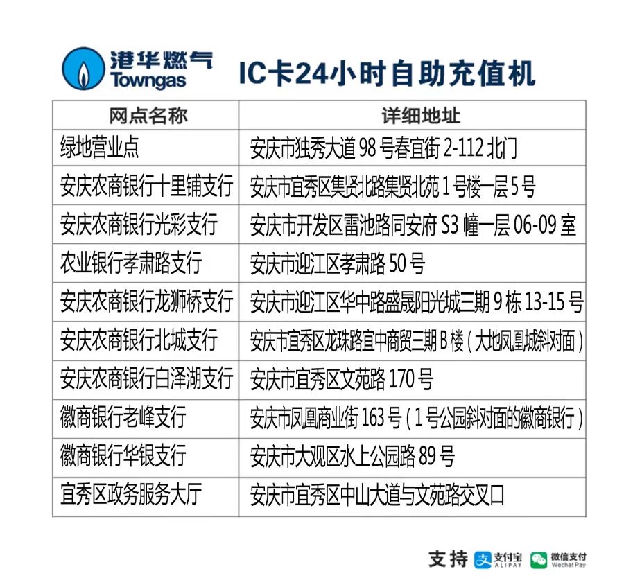 目前我公司支持交通銀行、徽商銀行、郵政儲(chǔ)蓄銀行、工商銀行、農(nóng)業(yè)銀行和浦發(fā)銀行的網(wǎng)上銀行和手機(jī)銀行,以及移動(dòng)“中國移動(dòng)”、電信“翼支付”、我公司微信公眾號(hào)和在“微信”-“生活繳費(fèi)”、“支付寶”-“生活繳費(fèi)”中查詢?nèi)細(xì)赓M(fèi)并繳納欠費(fèi)或預(yù)存氣費(fèi)。