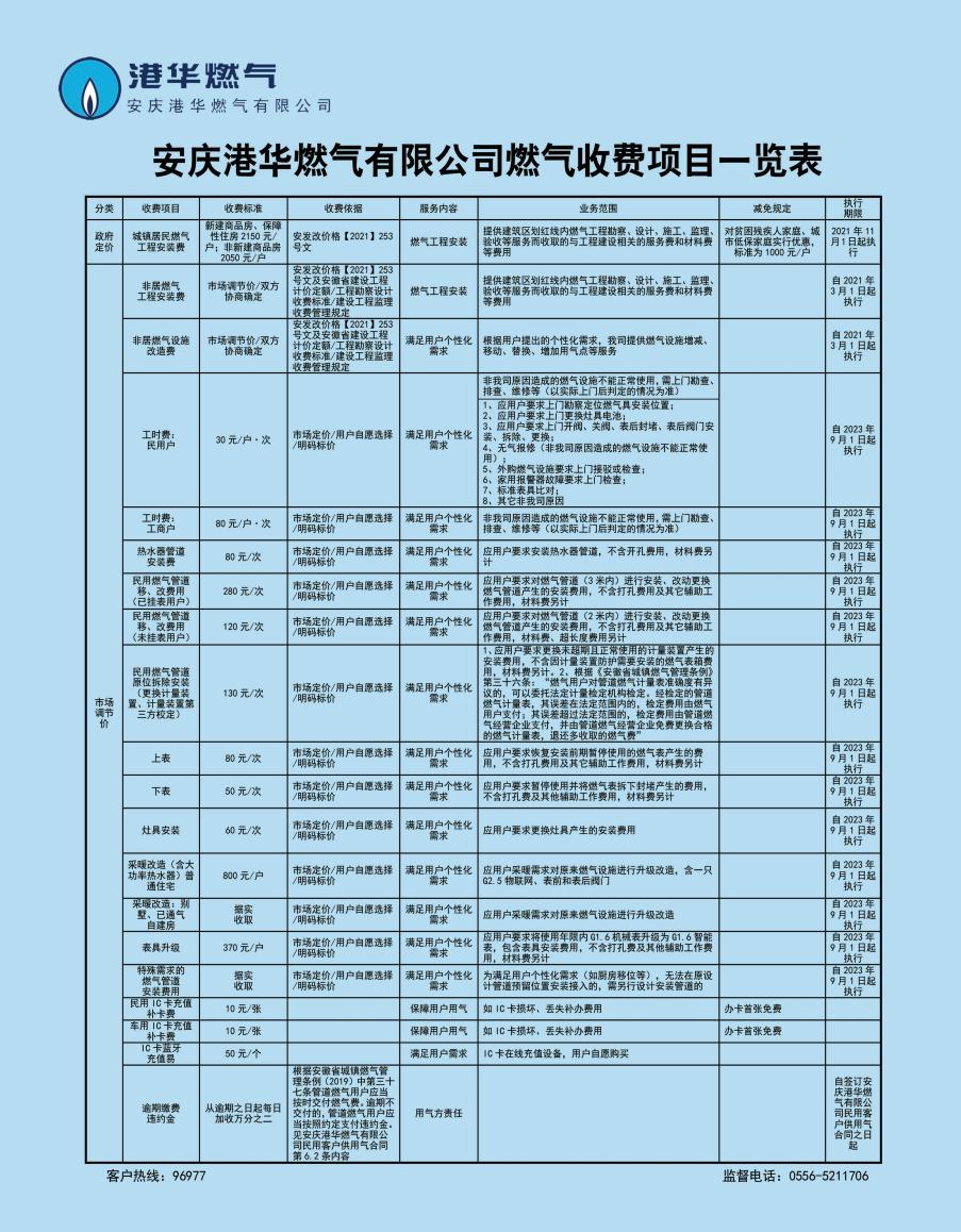 安慶港華燃氣有限公司收費項目一覽表(2023)