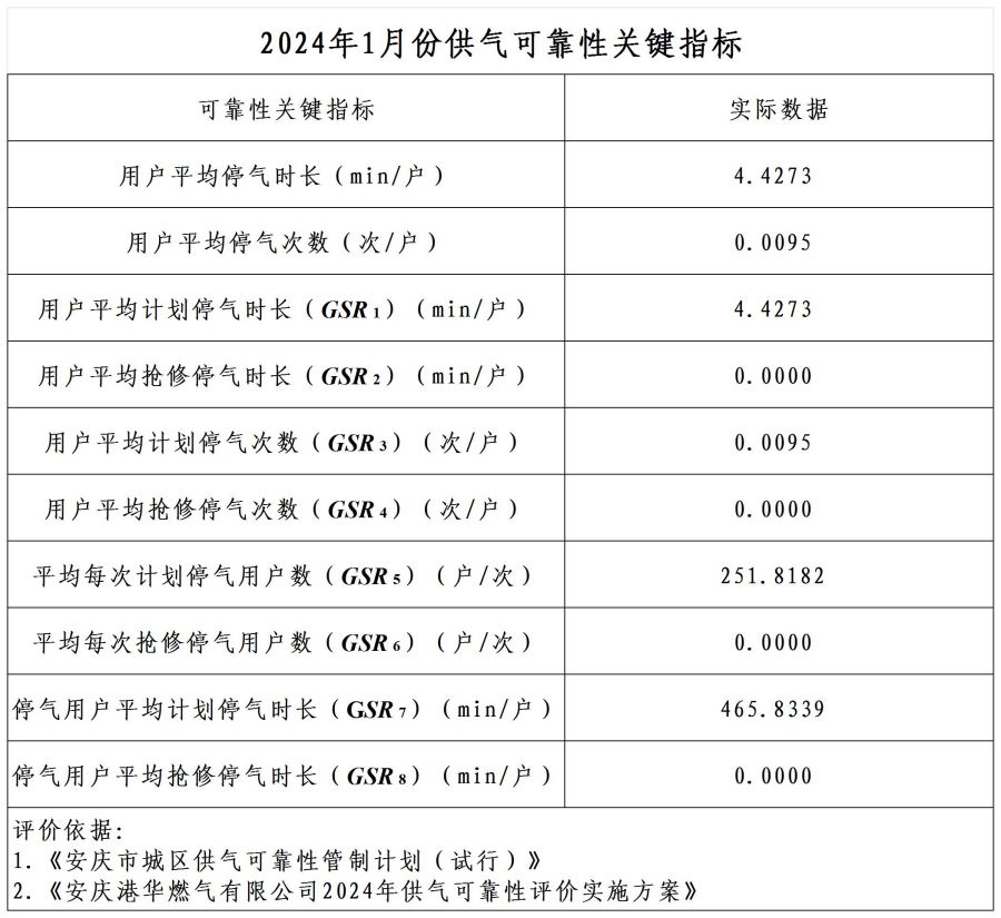 2024年1月供氣可靠性關(guān)鍵指標