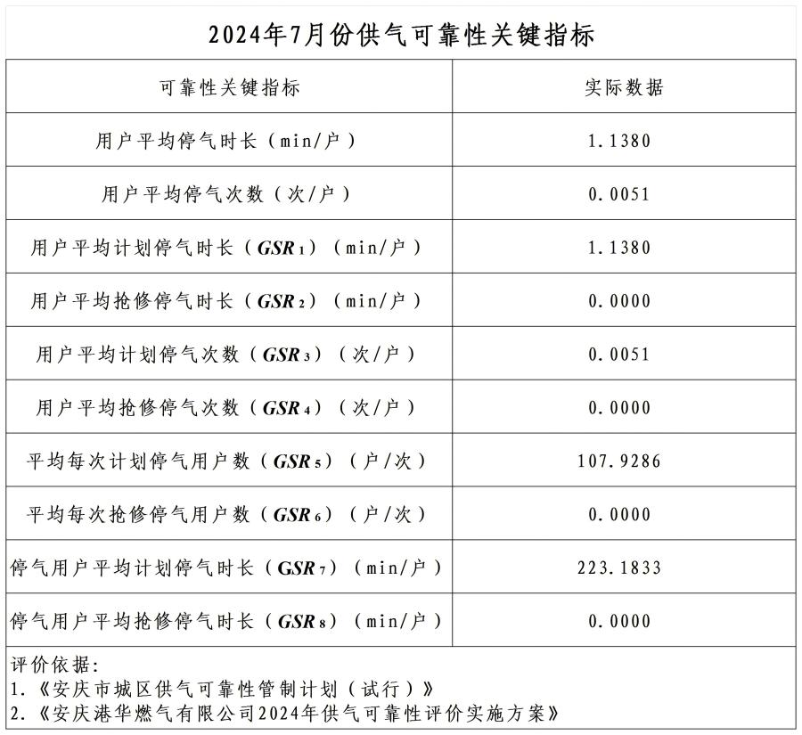 2024年7月份供氣可靠性關(guān)鍵指標(biāo)