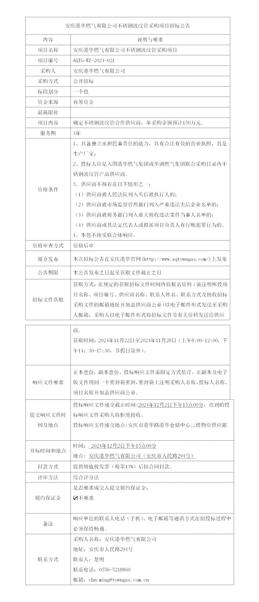 安慶港華燃?xì)庥邢薰静讳P鋼波紋管采購項目招標(biāo)公告