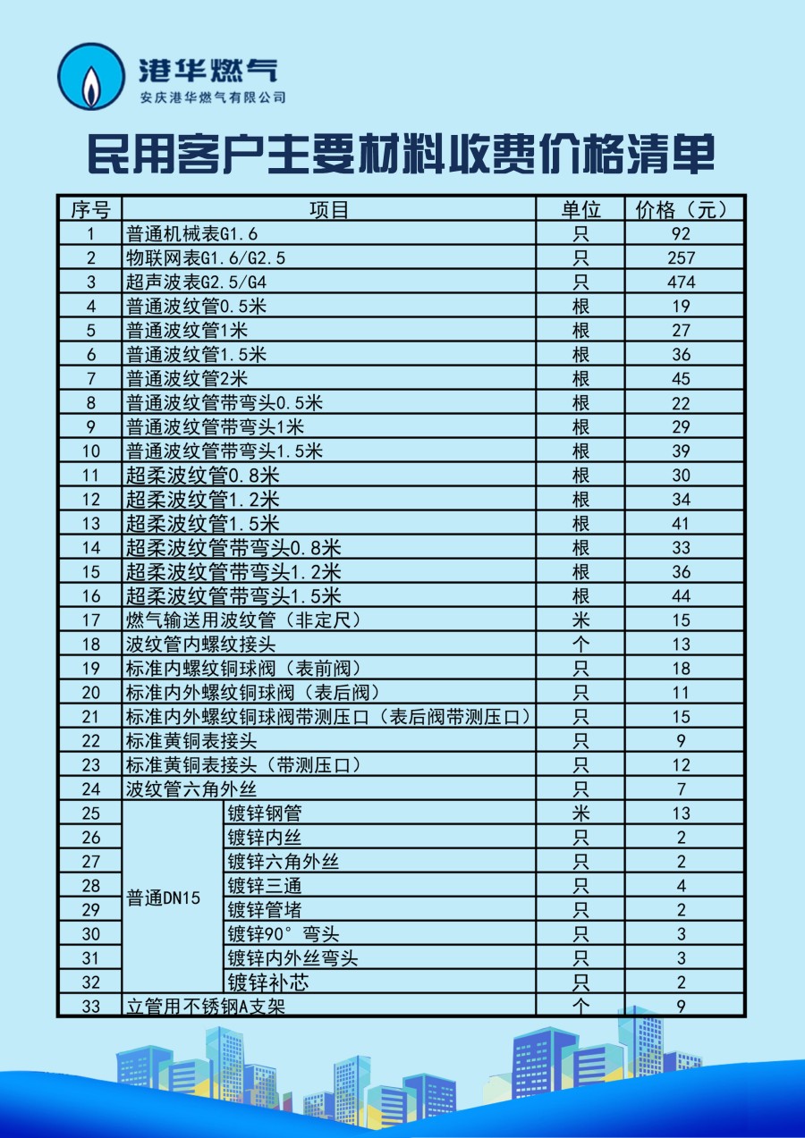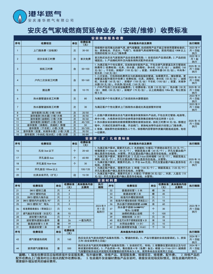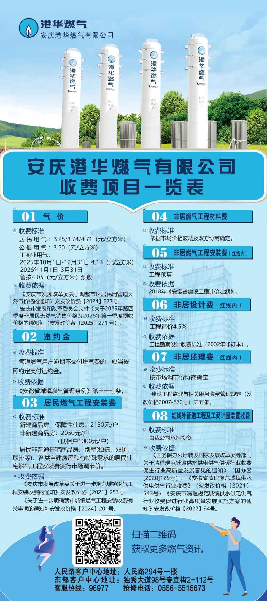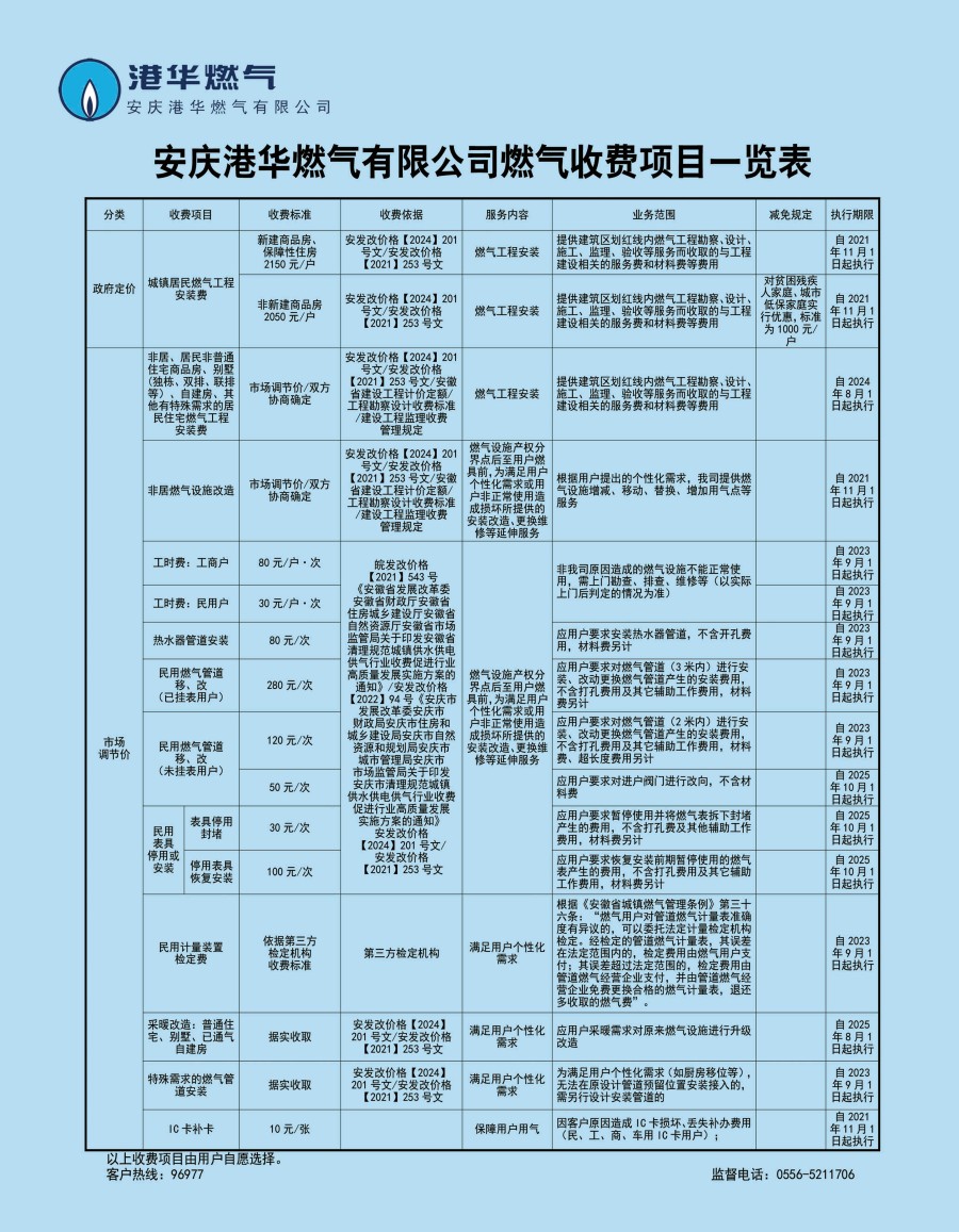 安慶港華燃氣有限公司收費項目一覽表(2025)