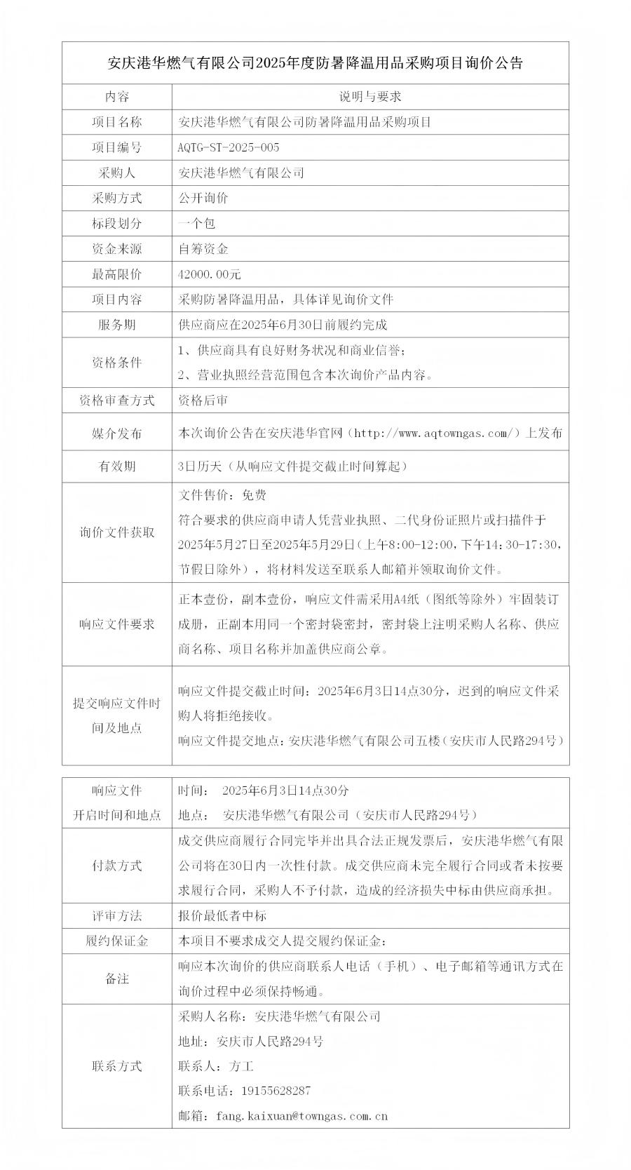 安慶港華燃?xì)庥邢薰?025年度防暑降溫用品采購項(xiàng)目詢價(jià)公告