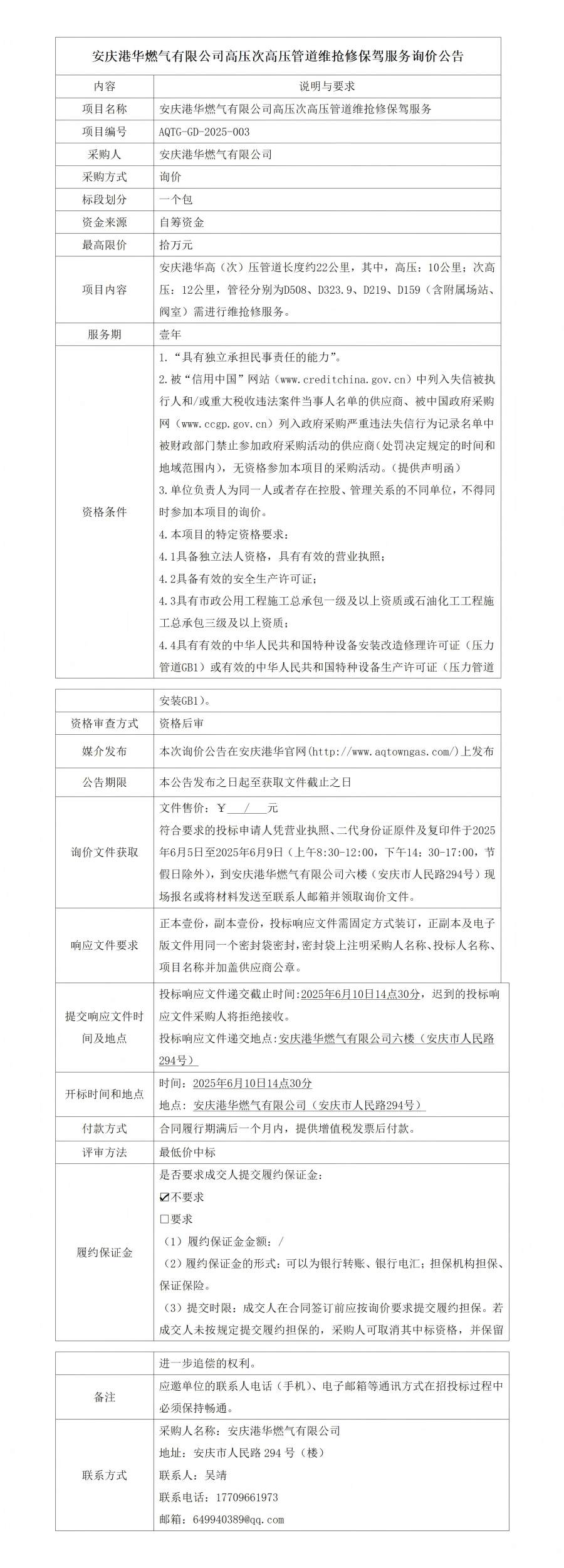 安慶港華燃氣有限公司高壓次高壓管道維搶修保駕服務(wù)詢價公告