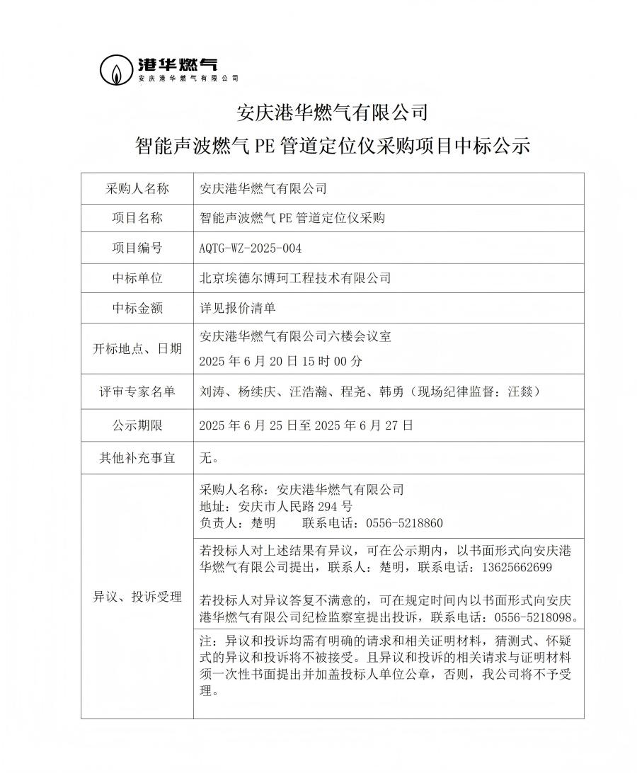安慶港華燃?xì)庥邢薰局悄苈暡ㄈ細(xì)釶E管道定位儀采購項(xiàng)目中標(biāo)公示