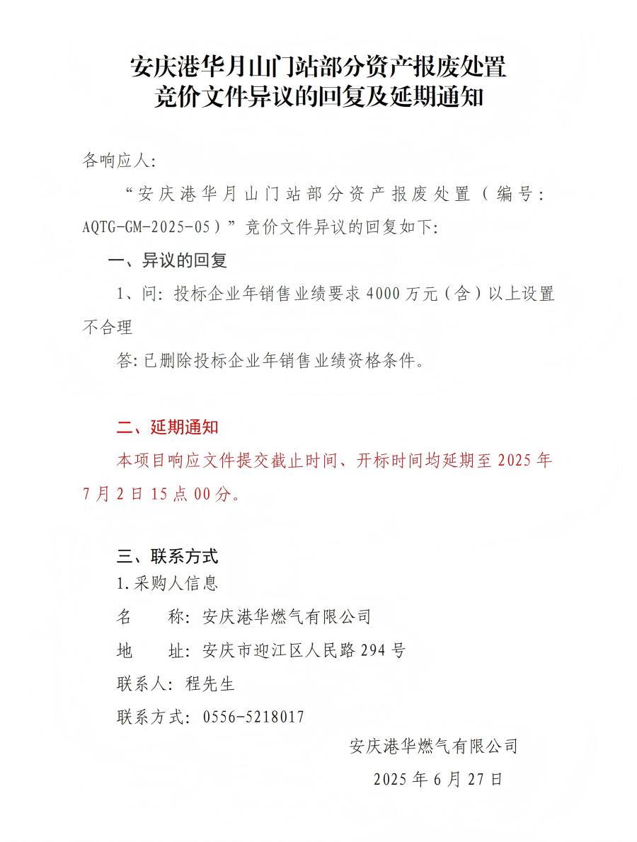 安慶港華月山門(mén)站部分資產(chǎn)報(bào)廢處置競(jìng)價(jià)文件異議的回復(fù)及延期通知