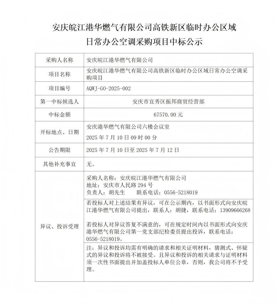 安慶皖江港華燃?xì)庥邢薰靖哞F新區(qū)臨時(shí)辦公區(qū)域 日常辦公空調(diào)采購(gòu)項(xiàng)目中標(biāo)公示