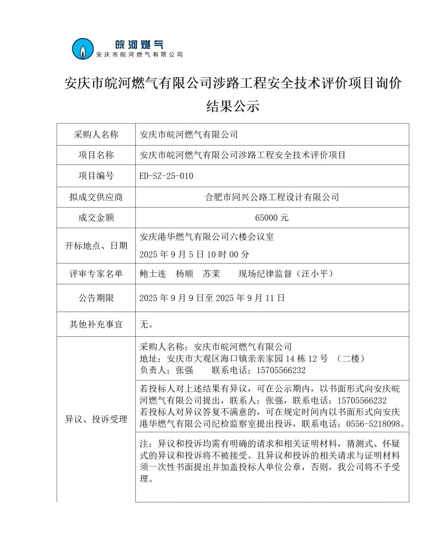 安慶市皖河燃氣有限公司涉路工程安全技術評價項目詢價結果公示
