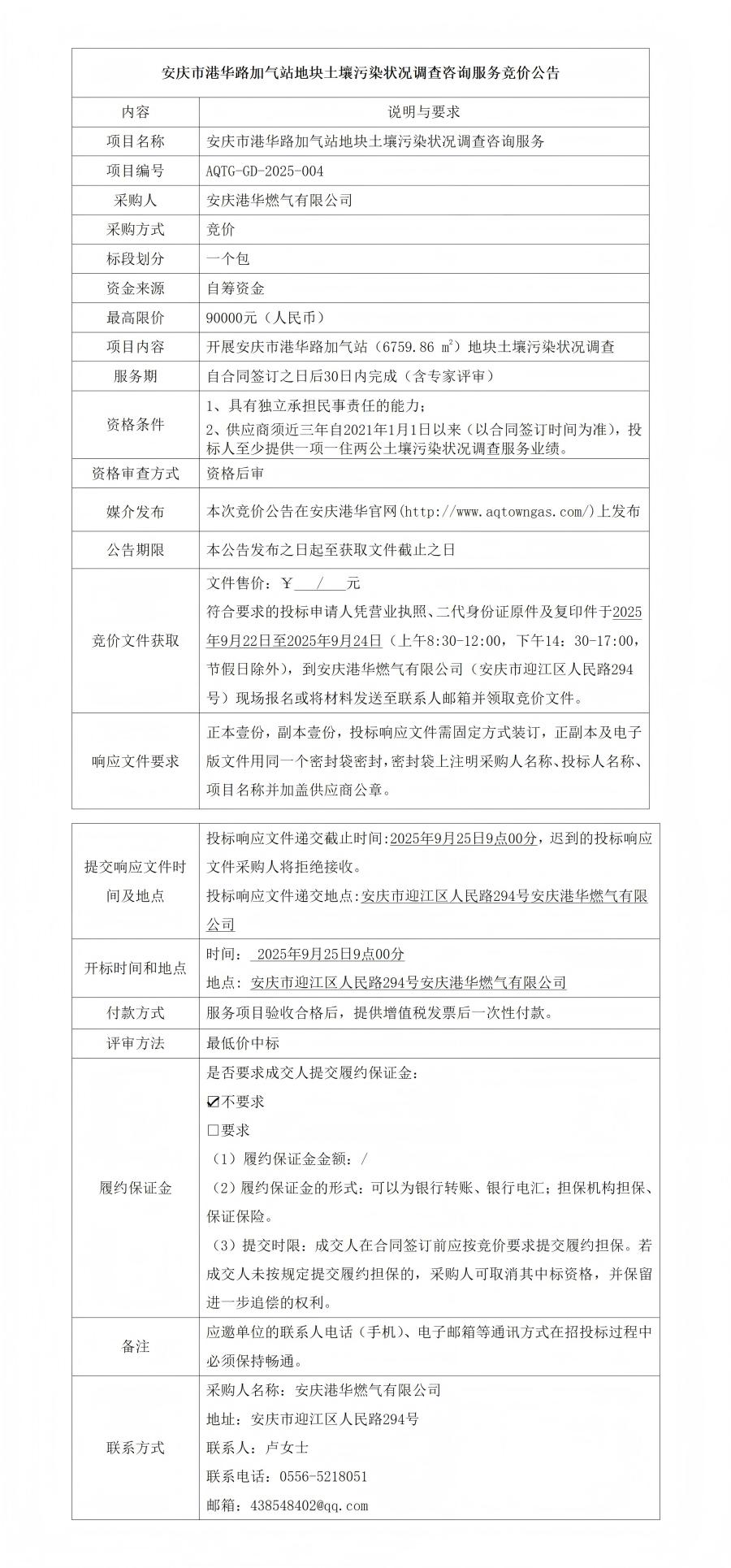 安慶市港華路加氣站地塊土壤污染狀況調(diào)查咨詢服務(wù)競價(jià)公告