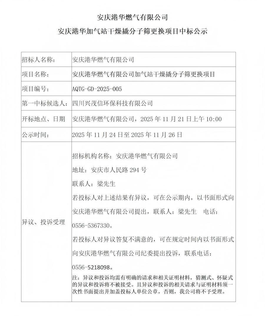 安慶港華燃?xì)庥邢薰景矐c港華加氣站干燥撬分子篩更換項目中標(biāo)公示