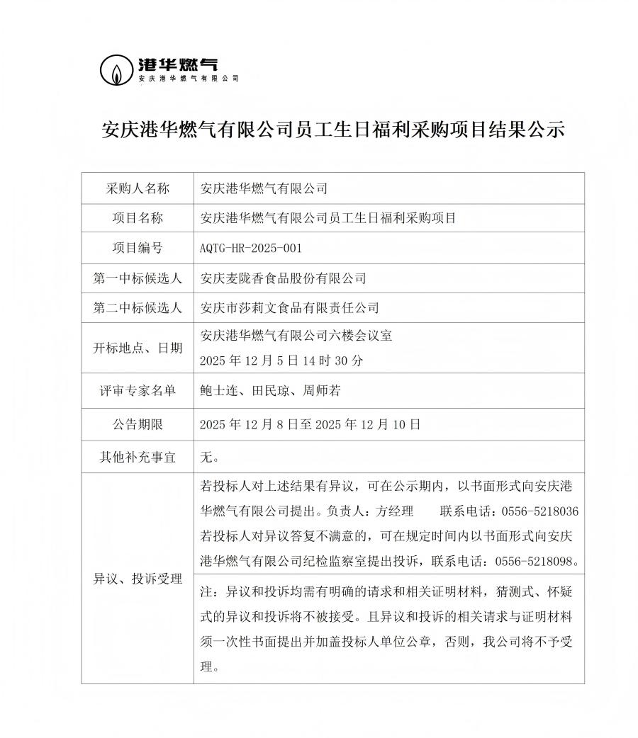 安慶港華燃?xì)庥邢薰締T工生日福利采購項(xiàng)目結(jié)果公示